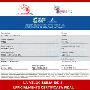 1° Edizione de “La Velocissima 10K”, manifestazione podistica di 10 Km inserita nel Calendario Nazionale Fidal classificata Bronze.
